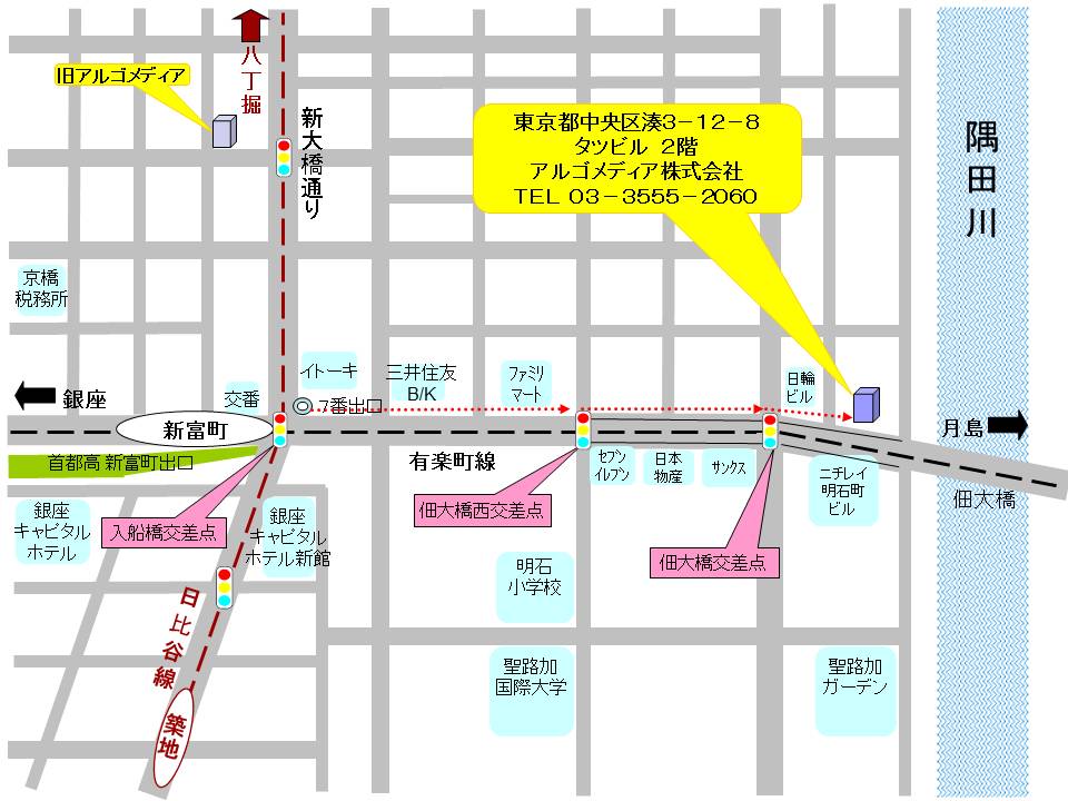 ● 地下鉄 有楽町線 新富町駅7番出口から徒歩5分(地図の赤矢印に沿って歩いて下さい)